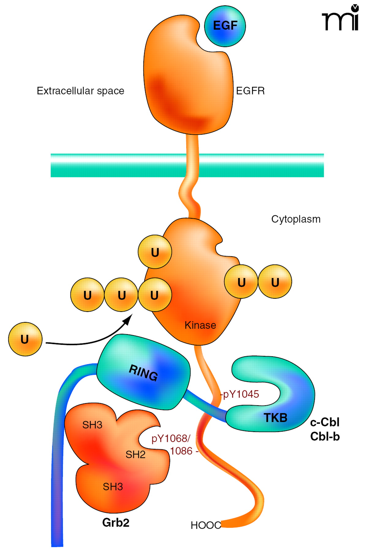 Interactions of the EGF receptor leading to receptor ubiquitination. EGF binding activates the receptor tyrosine kinase and results in phosphorylation of Tyr1045, Tyr1068, and Tyr1086 in the C terminus of the receptor. The SH3 domains of Grb2 are associated with the C terminus of c-Cbl or Cbl-b. A Grb2-Cbl complex binds to the receptor by means of the interaction of the SH2 domain of Grb2 with phosphorylated Tyr1068 or phosphorylated Tyr1086 (pY1068/86) and the tyrosine kinase binding (TKB) domain of c-Cbl or Cbl-b interacts with the phosphotyrosine 1045 (pY1045) of the receptor. Recruitment of E2 (not shown) to the RING domain of Cbl results in covalent attachment of monoubiquitin and polyubiquitin chains to the kinase domain of the receptor.