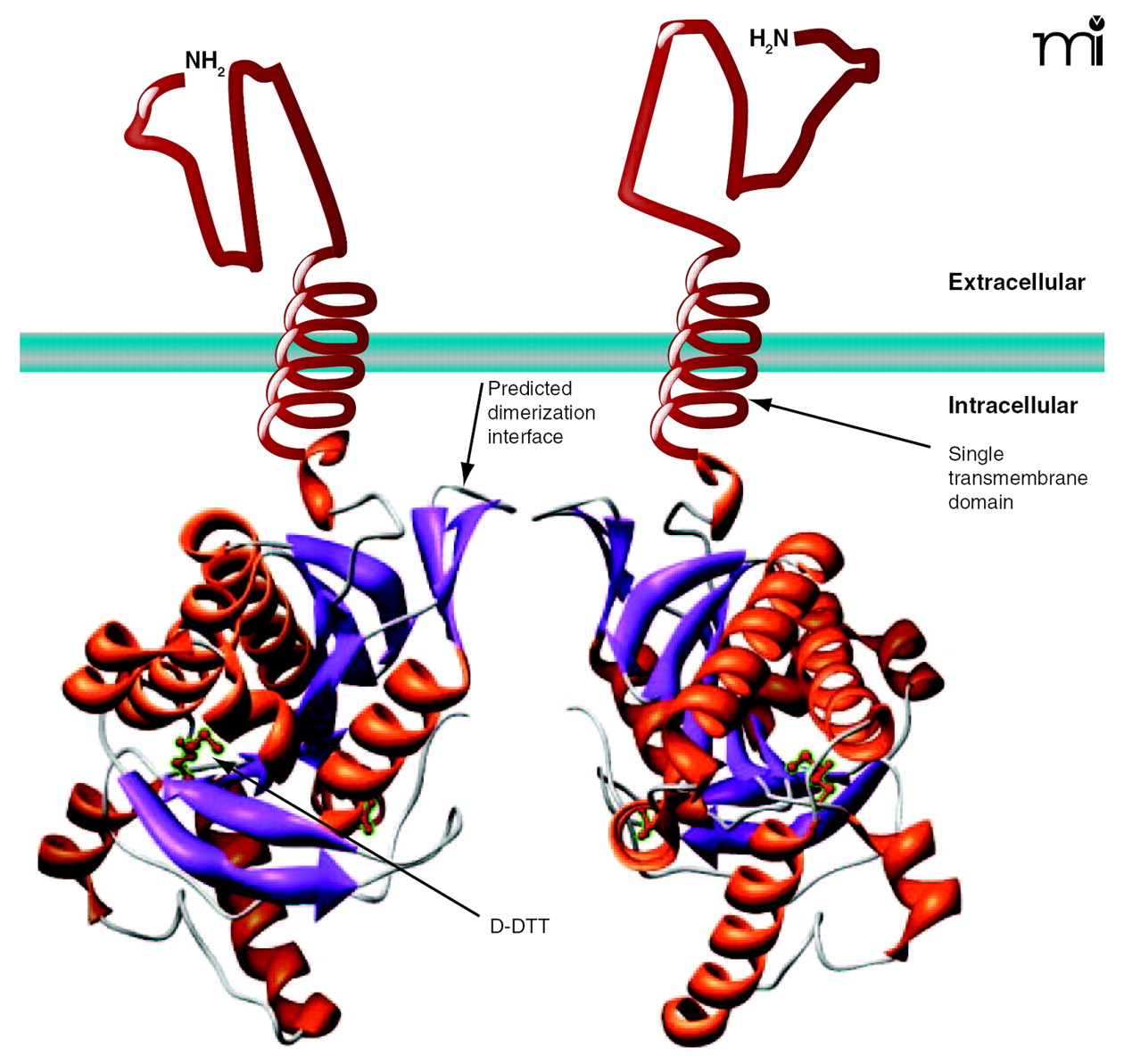 Representation ofT. bruceiadenylyl cyclases (ACs). The adenylyl cyclases (ACs) found in T. brucei contain a variable extracellular domain, a single transmembrane domain, and a catalytic domain. The catalytic domain shown is that of the GRESAG4.1, which can dimerize, leading to the activation of these enzymes. Development of synthetic ligands that force the dimerization of these ACs would provide valuable research tools to study the role of these enzymes in trypanosomes and may have possible therapeutic uses. Additionally, the crystal structure shows a molecule of (2S,3S)-1,4-dimercapto-2,3-butanediol (D-DTT) bound at a site within the catalytic domain. This site might be targeted through the development of agonists or antagonists designed to bind the AC and modulate its activity.