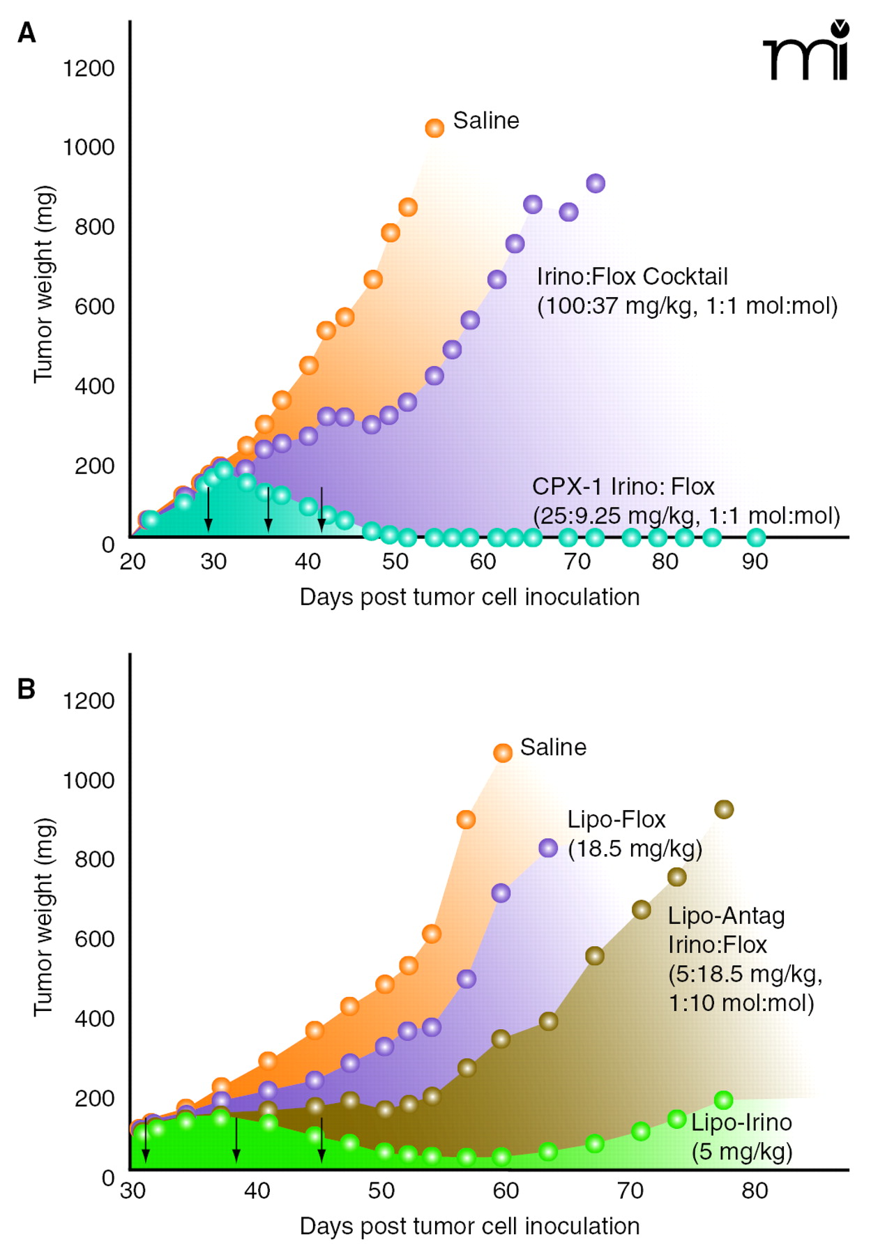 Increased efficacy of irinotecan and floxuridine depends on delivery of the synergistic ratio. (A) Liposomal delivery of a 1:1 molar ratio of the two drugs (synergistic in vitro) cures mice bearing human pancreatic solid tumors, whereas the conventional cocktail has minimal activity. (B) Liposomal delivery of a 1:10 molar ratio (antagonistic in vitro) is significantly less active against human pancreatic tumors growing in mice; the delivered 1:10 ratio is, in fact, less active than the administration of liposomal irinotecan alone. In both panels, arrows indicate treatment days. See text for details.