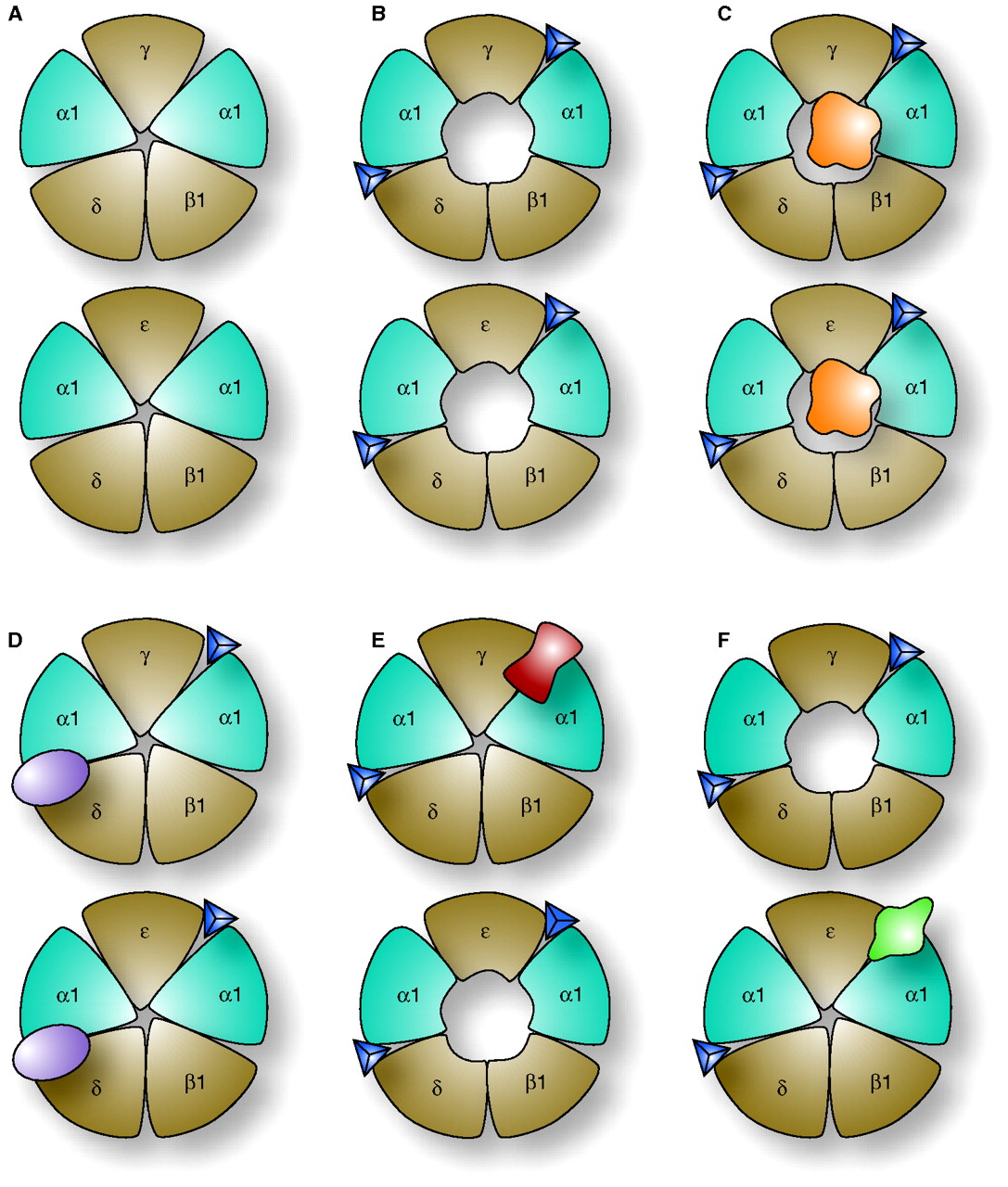 Alternative target sites of acetylcholine receptors (nAChRs). Each panel (A to F) shows two muscle nAChRs; the top receptor is the “fetal” subtype, with a γ subunit, and the bottom is the “adult” subtype, with an ε subunit. In the absence of acetylcholine (blue triangles) receptors are closed. When two molecules of acetylcholine bind (as shown in B), a transition from a closed to an open state occurs (compare A to B). Panels C, D, E, and F show effects of different conotoxins. Panel C demonstrates one possible mechanism of non-competitive block. In this example, the toxin (orange globular geometry) occludes ion conductance through the channel pore. Panels D, E, and F show competitive antagonists targeted to different pharmacological sites. In panel D, a conotoxin (purple) highly specific for α1δ is shown; this inhibits both fetal and adult subtypes. In E, a conotoxin (red) specific for the α1γ interface binds the fetal receptor, but not the adult subtype (which can therefore open normally). The converse is true in F, in which the conotoxin (green) is specific for α1ε; this does not inhibit the fetal subtype, but prevents acetylcholine from binding one of the two ligand sites in the adult subtype. Thus, to inhibit both receptors subtypes, either a single peptide with the specificity shown in D, or two different peptides with the specificities shown in E and F are required. In fish-hunting Conus venoms, there are usually two or more peptides targeting these muscle receptors; a venom with both the peptides shown in C and D would inhibit these receptors more efficiently than venoms with only one type of nAChR antagonist.