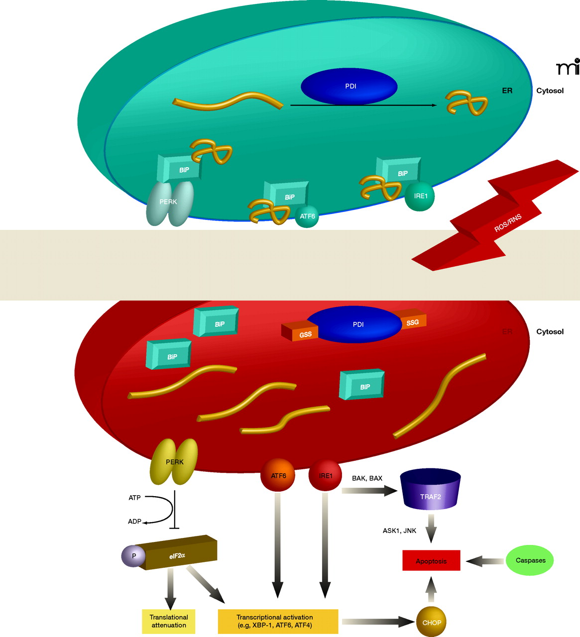 The Unfolded Protein Response (UPR) and pro-apoptotic pathways. The UPR is a complex signaling cascade that can be induced by stress and the accumulation of malfolded proteins in the ER. During homeostasis (upper schematic; blue), protein disulfide isomerase (PDI) promotes the proper folding of immature proteins (yellow strings). The ER-resident protein BiP associates with properly folded proteins and concomitantly inhibits three ER transmembrane proteins, namely, PERK, ATF6, and IRE1. Under conditions of oxidative and nitrosative stress (indicated by ROS/RNS and red background in lower ER schematic), PDI is modified (see text for discussion) and rendered inactive, and unfolded proteins (yellow strings) accumulate in the ER. BiP dissociates from improperly folded proteins and concomitantly surrenders negative regulatory interactions with PERK, ATF6, and IRE1. PERK thereby phosphorylates and inactivates (blunt arrow) eukaryotic translation initiation factor eIF2α, the phosphorylation of which is also associated with transcriptional activation of genes involved in the UPR. This transcriptional activation, which is also promoted by the activation of ATF6 and IRE1, can drive pro-apoptotic signaling, particularly through activation of CHOP (see text for details). IRE1 can also interact with TRAF2, which can function pro-apoptotically through association with ASK1 and JNK (see text; also see Figure 2). A third route to apoptosis is offered by caspase activity; intriguingly, regulation of caspase activity (particularly that of CASP3) may also be a function of GST.
