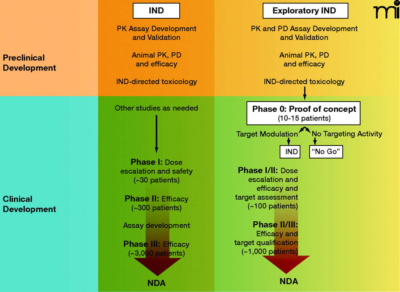 Key components of cancer drug development from preclinical evaluation through NDA submission following traditional (Phase I) or exploratory IND (Phase 0) clinical pathways. The objective of preclinical studies performed to support a traditional IND is to estimate a starting dose for Phase I trials which is both safe and allows for the possibility of clinical benefit. Subsequent Phase II and III trials continue to monitor drug safety and bioavailability as well as evidence of efficacy. Large numbers of patient volunteers are needed at each clinical stage, and the drug can fail for unacceptable toxicity, poor pharmacokinetics, or lack of efficacy at any point during this pathway. The objective of Phase 0 trials is to anticipate clinical failure and potential efficacy. Study endpoints focus on target modulation, necessitating development and validation of plasma drug (pharmacokinetic) and preclinical biomarker (pharmacodynamic) assays during preclinical evaluation. If the drug shows promise, the experimental IND is closed and further development proceeds under a traditional IND to explore drug safety. Phase I/II trials (target assessment studies) of molecularly-targeted agents can then be performed with a qualified pharmacodynamic assay that could enhance the basis on which future development decisions for the agent are made. Progression to Phase II/III randomized trials would then occur with a stronger scientific base. PK, pharmacokinetics; PD, pharmacodynamics; NDA, new drug application; IND, investigational new drug.