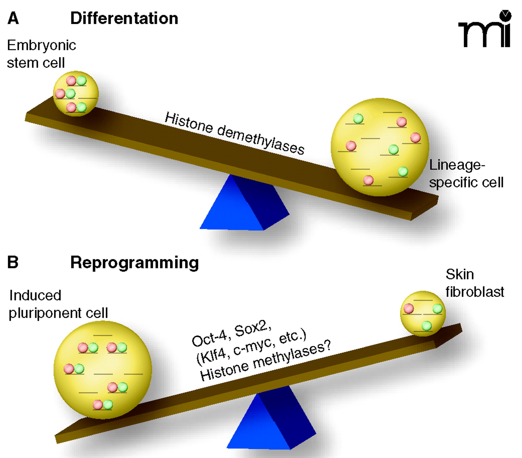 The see-saw of differentiation. Chromatin patterns of histone modification (i.e., acetylation, methylation, etc.) determine accessibility for transcription factors and, thus, direct tissue-specific transcription. A recent study identified a novel pattern of histone 3 methylation that is unique for embryonic stem cells (A). The epigenetic mark, termed bivalent [because it includes H3K4 methylation (green circles) as well as H3K27 methylation (pink circles)] can be found at the transcriptional start sites of many developmental genes (1, 2). These sites are poised for transcription in stem cells and resolve upon differentiation in either H3K4 or H3K27 methylation, associated with transcriptional activation or repression, respectively. Skin fibroblast cultures (upon introduction of four transcription factors) can revert into stem cells (iPS, induced pluripotent cells) (17). (B) Upon de-differentiation, the bivalent chromatin pattern is re-established. Identifying the key molecular mechanisms that are responsible for making the switch between pluripotency and lineage specificity opens the possibility of manipulating the see-saw of differentiation for regenerative medicine.