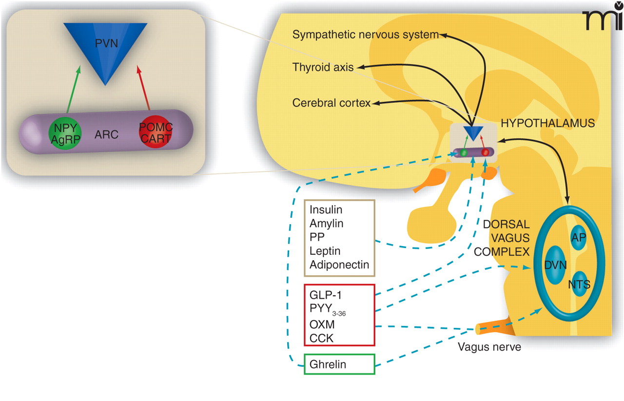 Integration of peripheral signals and central neuronal mechanisms in energy homeostasis and body weight. The hypothalamus and the dorsal vagal complex in the brainstem are central to the regulation of appetite. Hypothalamic circuits that control appetite are schematized in the inset (ARC, arcuate nucleus; PVN, paraventricular nucleus; NPY, neuropeptide Y; AgRP, Agouti related peptide; POMC, pro-opiomelanocortin; CART, cocaine and amphetamine regulated transcript). NPY- and AgRP-expressing neurons stimulate appetite (i.e., are orexigenic; green color); POMC- and CART-expressing neurons counterbalance this by reducing appetite (i.e., are anorexigenic; red color). The dorsal vagal complex comprises three nuclei: the area postrema (AP), the dorsal vagal nucleus (DVN), and the nucleus tractus solitarius (NTS). Peripheral signals are shown in boxes at the left (PP, pancreatic polypeptide; PYY3-36, peptide YY3-36; OXM, oxyntomodulin; CCK, cholecystokinin). The dashed arrows indicate their probable sites of action on the central mechanisms.
