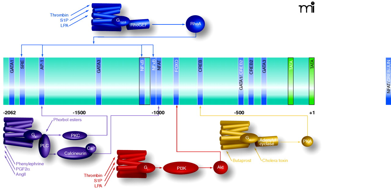 Promoter sequences from the CCN1-encoding gene and selected transcriptional response elements. The center portion of the Figure lists promoter elements that have been determined through studies of the human (white text) and murine (black text) gene. Above and below the schematized promoter are GPCR-mediated signaling pathways that could regulate expression of the gene by targeting selected promoter elements. GPCRs (colored structures of seven cylinders) are located in the plasma membrane and preferentially couple to distinct G proteins as indicated (see text for details).