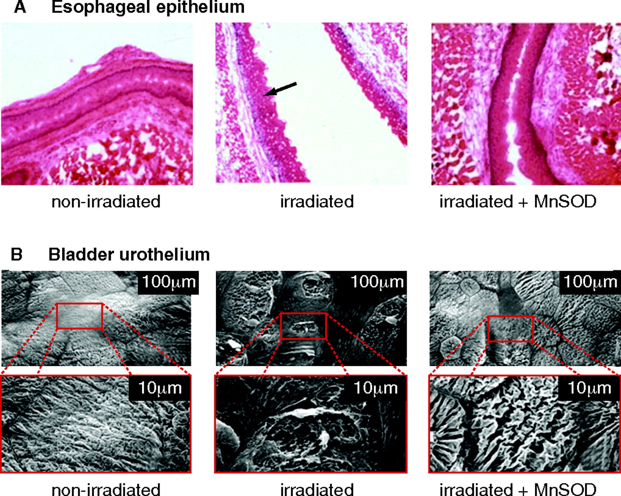 Radiation damage and protection by MnSOD. A. Brightfield micrograph depicting changes that occurred in esophageal epithelium after irradiation (30 Gy). The non-irradiated esophagus showed normal intact epithelium (n=5). Alternatively, the arrow in the irradiated micrograph points to holes in esophageal epithelial cells which represent nuclei that have undergone apoptosis and are no longer present (n=5). Intraesophageal administration of MnSOD 24 hours prior to irradiation protected the epithelial cells from undergoing apoptosis (n=5). Adapted from (35). B. Scanning electron micrographs depicting changes that occurred in the bladder urothelium after irradiation. The bottom electron micrographs are enlargements of the areas enclosed by the rectangles in the top micrographs. The non-irradiated bladders showed normal intact urothelium (n=7). However, 48 hours after irradiation (35 Gy), the bladder urothelium showed areas of superficial ulcerations of the umbrella cells (n=6). In rat bladders transfected intravesically with the human MnSOD transgene 24 hours prior to irradiation, the urothelium showed only minimal ulcerations (n=5). Adapted from (22, 37).