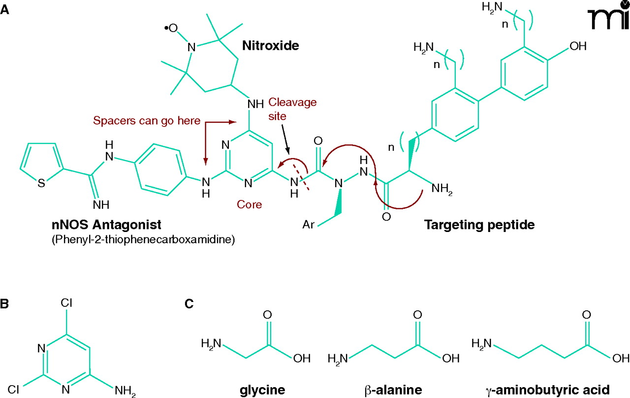 Scheme for dual-action drug ligation using a pyrimidine core and amino acid spacer groups. A. As a core structure to ligate mtNOS inhibitors, ROS scavengers (e.g., TEMPO derivatives) and targeting peptide, one can choose a commercially available compound such as 4-amino-2,6-dichloropyrimidine B. The halogen atoms on this heterocycle can be selectively displaced with amine nucleophiles, and the amino function can serve as the attachment point for the targeting peptide. C. Additional bifunctional amino acid spacer groups (e.g., glycine, β-alanine or γ-aminobutyric acid) can be readily introduced (unpublished data).