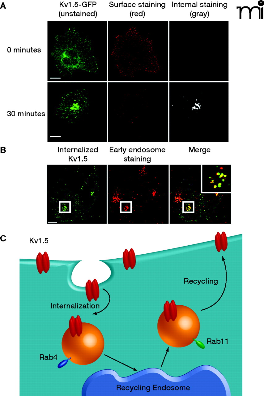 Trafficking of the Kv1.5 channel in HL-1 atrial myocytes. The Kv1.5 channel was constructed as a green fluorescence protein–fusion product in which a single GFP is inserted into an extracellular domain of Kv1.5; the GFP sequence functions as a single epitope in the immunostaining of expressed Kv1.5–GFP described here. (All scale bars are 5 μm.) A. Internalization of Kv1.5–GFP can be monitored as redistribution of green fluorescence over time [left panel; cells following 0 (top) and 30 minutes (bottom) incubation at 37oC are respectively shown]. Because the cells shown were incubated in the presence of a non-fluorescing primary anti-GFP antibody that does not affect trafficking, co-incubation of the cells at 0 or 30 minutes with a saturating red-fluorescing secondary antibody (middle panel) indicates the population of Kv1.5–GFP that remains accessible at the cell surface at the given time; subsequent fixation, permeabilization, and incubation of the cells with a gray-appearing antibody (i.e., non-red; right panel) identifies Kv1.5–GFP that has been internalized from the cell surface. B. Confocal imagery establishes that internalized Kv1.5 can be trafficked to early endosomes. The internalization assay was performed for 30 minutes as described above. Cells were fixed, permeabilized, and stained for internalized Kv1.5 as well as for the early endosomal marker EEA1. The merged image shows co-localized of channel with EEA1 as indicated by yellow punctae. C. The schematic represents the Kv1.5 internalization and recycling pathway. As verified by the confocal imagery with internalized Kv1.5 and shown in the schematic, trafficking of Kv1.5 is both Rab4- and Rab11-dependent. (See text for details.)
