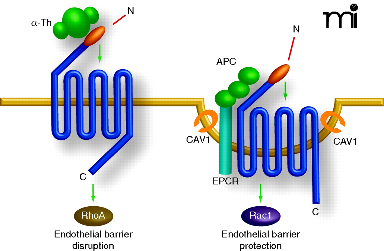Caveolae are required for APC-mediated but not thrombin-mediated activation of PAR1 signaling. Thrombin (α-Th) activates RhoA but not Rac1 signaling and promotes endothelial barrier permeability. PAR1 is essential for thrombin –induced endothelial cellular responses but does not require caveolae for signaling. EPCR the co-factor for APC, PAR1, and G proteins associate with caveolin-1, a structural component essential for caveolae formation. In contrast to thrombin, APC activates PAR1 and induces robust Rac1 signaling but not RhoA activation, to promote endothelial barrier protection. The expression of PAR1 is required for APC cellular signaling. Moreover, APC activation of PAR1 barrier protective signaling requires compartmentalization in caveolae.
