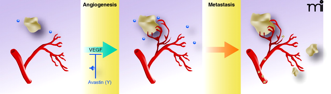 VEGF, angiogesis, tumors, and inhibition by Avastin. The biological coordination between tumorigenesis and angiogenesis is mediated by proangiogeneic factors such as VEGF. Antibody strategies have resulted in drugs like Avastin that work to bind VEGF, blocking angiogenesis and thereby interfering with the disease. Blue circles represent VEGF; gold circles in right-hand panel represent metastases and possible exosome release.