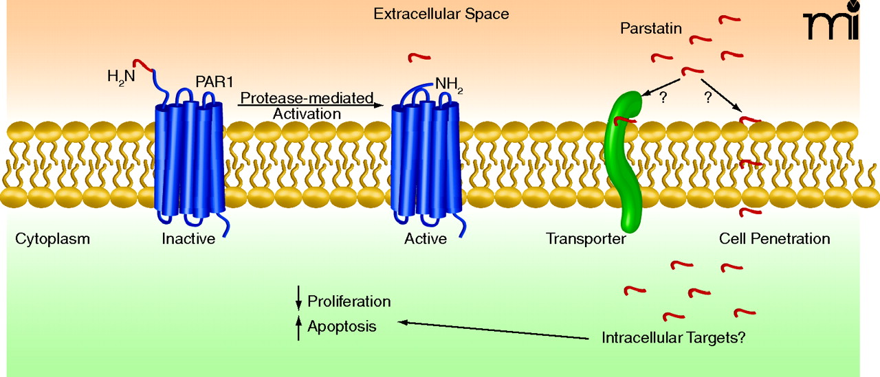 Processing of parstatin from the protease-activated receptor (PAR1). PAR1 is a G protein–coupled receptor expressed on a variety of cell types. Serine proteases activate PAR1 by cleaving a forty-one amino-acid fragment and inducing activation of a tethered ligand. The cleaved peptide, parstatin, localizes at the cell surface and is internalized perhaps by transporter- or lipid-mediated cell penetration. Parstatin subsequently inhibits cell proliferation and induces apoptosis.