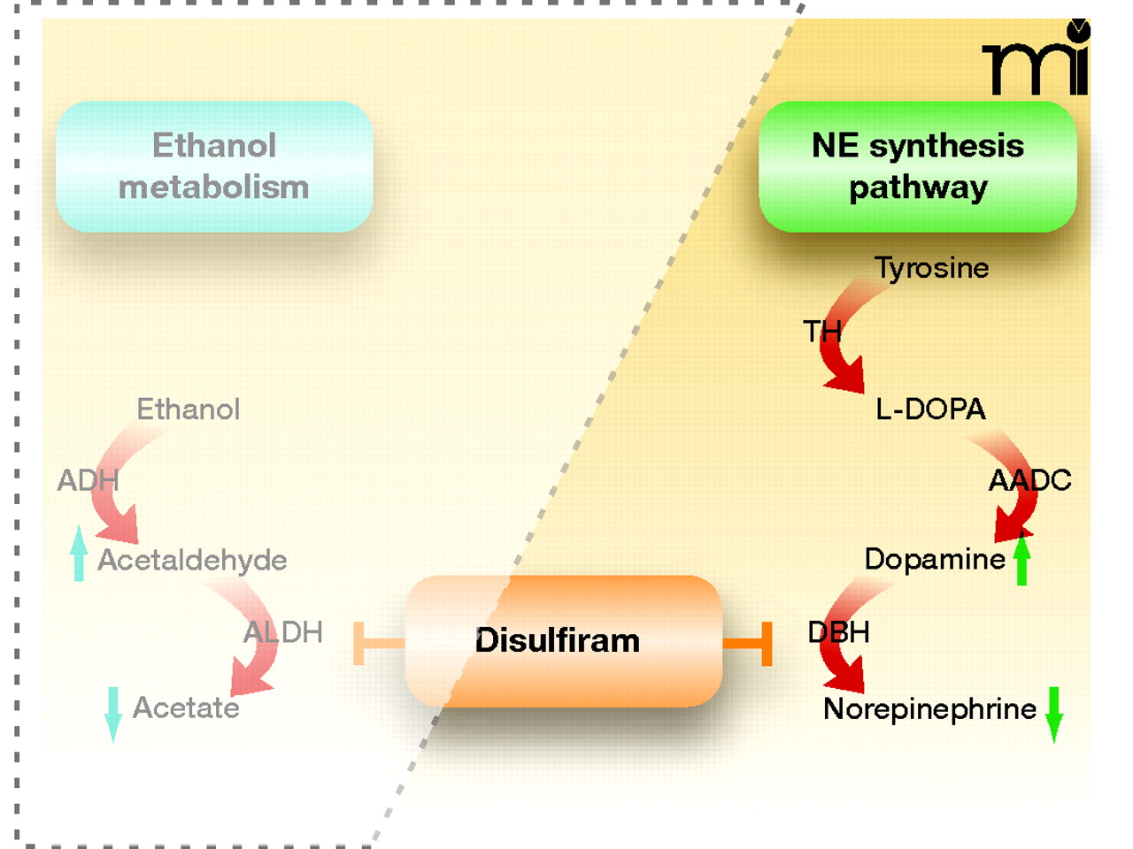 Disulfiram inhibition of the norepinephrine (NE) biosynthetic pathway. In the catecholamine synthesis pathway, tyrosine is converted into 3,4-dihydroxy-L-phenylalanine (L-DOPA) by tyrosine hydroxylase (TH), which is then transformed into dopamine by aromatic amino acid decarboxylase (AADC), whereupon dopamine b-hydroxylase (DBH) converts dopamine into norepinephrine. Disulfiram inhibits DBH, reducing the production of norepinephrine and increasing the pool of dopamine.