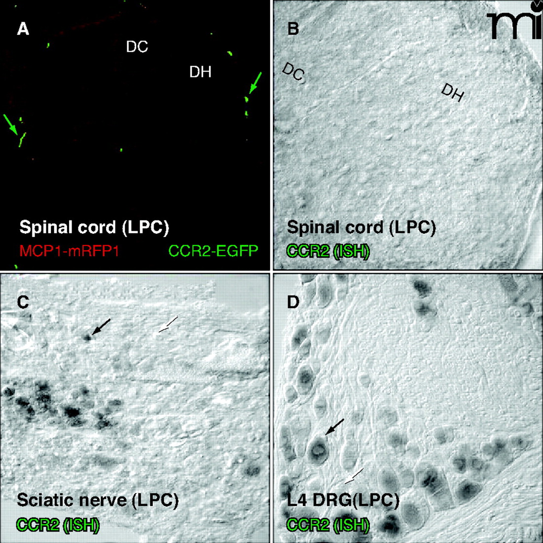 Peripheral nerve demyelination induces CCR2. CCR2–mRNA is induced in both the site of the nerve injury and in the sensory neurons of the dorsal root ganglion (DRG), but not in the associated spinal cord. (A) Neither the MCP1 monomeric red fluorescent protein-1 (MCP1–mRFP1) nor the CCR2 extra green fluorescent protein CCR2–EGFP in transgenic mice subjected to LPC-induced demyelination of the sciatic nerve exhibited expression of MCP1 or CCR2 at a detectable level. Leukocytes outside the spinal cord were clearly visible (green arrow). (B–D) CCR2 expression was also examined at the mRNA level by in situ hybridization. The spinal cord does not contain significant CCR2-expressing cellular components (B), whereas many cells in the sciatic nerve (C) and DRG (D) express CCR2 receptors in the LPC group. DH, Dorsal horn; DC, dorsal column.