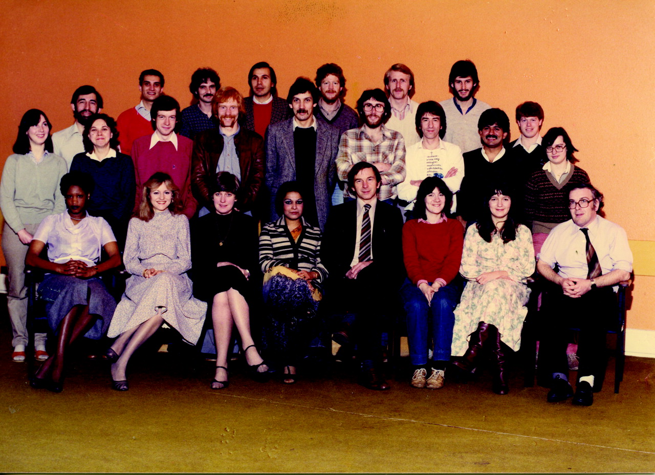 Snapshot (1980s): Some of the Cancer Research Campaign’s Experimental Chemotherapy Group. Center (standing) John Hickman and Andy Gescher (leather jacket); top, far right, Neil Gibson; top, far left, John Slack; middle, third from right, Simon Langdon (white T-shirt); front row, center, Malcolm Stevens (sitting).