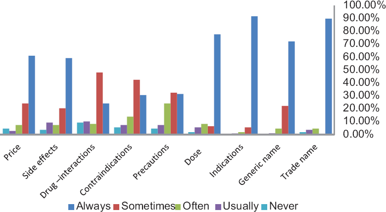 The trade name, indications, dose, and generic name were almost always mentioned as products attributes as compared to drug interactions, contraindications, and precautions to the doctors [Figure 1]. | Figure 1:The frequency of product attributes promoted to the doctors by medical representatives